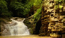 Республика Адыгея славится множеством прекрасных водопадов. Пожалуй самыми известными из них являются водопады на ручье Руфабго - небольшом притоке реки Белая, впадающем в нее в районе поселка Каменномостский. Посмотреть на эти великолепные творения воды и камня, можно пройдя по оборудованной туристической тропе вдоль ручья. Второй водопад ручья Руфабго носит название Каскадный. Чтобы попасть сюда, после осмотра первого водопада, называющегося Шум, вы пройдете чуть меньше километра по тенистой лесной тропинке вдоль ручья. Водопад Каскадный невелик - преодолевая три невысоких каскада, широким веером тонких струек вода стекает в глубокую каменную чашу. Из-за своих небольших размеров водопад получил ласковое прозвище Малыш.