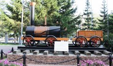 Макет «пароходного делижанца» Черепановых. Первый российский паровоз, сконструированный и построенный в августе 1834 года на Нижнетагильском металлургическом заводе Демидовых крепостными отцом и сыном Черепановыми.