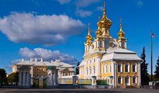Церковный корпус Большого дворца в Петергофе был построен в 1745 году по проекту архитектора Растрелли.Храм летней резиденции российских монархов был освящен в 1751 году.Здесь сочетались браком,крестили детей,проводили богослужения. Внутреннее убранство храма поражало своим великолепием.Шестиярусный иконостас был украшен витыми колоннами,императорской короной и вензелем императрицы Елизаветы Петровны.Настенная резьба была покрыта сусальным золотом,стены,потолок и купол были разрисованы картинами религиозной тематики.Под куполом был изображен Святой Дух в виде голубя. В годы Великой Отечественной войны Церковный корпус был разрушен.В 1950-х годах были воссозданы фасады храма по первоначальному проекту Растрелли с одним куполом. Исторические пять куполов были восстановлены в 2003 году. 12 июля 2011 года торжественно открылся музей "Церковный корпус" Большого дворца.Этим открытием ознаменовалось окончание многолетних работ по восстановлению Церковного корпуса.В музее можно увидеть предметы церковной утвари,иконы конца XVIII - начала XIX веков,облачение священнослужителя,крестильный набор и так далее.