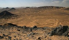 Примерно в 100 км к северо-востоку от Белой пустыни находится еще один памятник природы - Черная пустыня. Свое название она получила из-за множества вулканических гор и маленьких черных камней. Камни прекрасно контрастируют с оранжево-коричневой землей, так что пейзажи здесь очень выразительные. Черной пустыню назвали из-за размыва вулканических пород, вследствие которого пустыня покрылась слоем черной каменной пыли и камней. Практически в самом конце пустыни находятся черные вулканические холмы. Тысячи лет тому назад эти горы извергали темный пепел. В этой вулканической породе содержался долерит. Это магматическая порода, близкая по своему составу к базальту. Из этого материала и состоят черные камни, которыми усеяна пустыня. Туристы могут забраться на самую высокую точку Черной пустыни - так называемую, Английскую гору. С ее вершины открывается удивительный, немного странный, но в то же время очень живописный вид. Увидеть Черную пустыню можно, двигаясь по дороге из Бахарии в Фарафру. Кроме того, есть возможность совершить более полноценное "погружение" в пустыню, заказав экскурсию либо в Бахарии, либо в Фарафре.