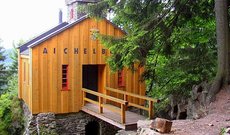 Замок – крепость Айхельбург расположен на восточном склоне гор Пец-под-Снежкой возле деревни Темный Дул, в Чехии. Замок был построен на арочном мосту над рекой Упа, на высоте 115 метров над уровнем этой реки. Это своеобразная дань памяти графу Айхельбургу, трагически погибшему в мае 1861 года. При постройке крепости не было использовано ни единого гвоздя, только дерево, скрепленное особым образом. В настоящее время, можно увидеть, маленькую крепость, представляющую собой деревянную пристройку с остатками смотровой башни. В замок ведет небольшой подвесной мостик, перекинутый через ров. Внутри вы можете увидеть просторный зал, где можно ознакомиться с личными вещами графа Бертольда Айхельбурга. Здесь же, на всеобщее обозрение выставлен бюст графа, выполненный из стекла, а в соседней комнате – его посмертный портрет. Памятная плита расскажет о самом графе, кто этот человек и что он сделал. Со смотровой площадки башни замка, открывается великолепный вид на окружающую природу, а также панорама деревни Темный Дул. В конце девяностых годов XX века были восстановлены два исторических пешеходных пути, ведущих в замок – от реки Упа и со стороны рудников Темного Дула. А для любителей горных велосипедов была проложена своя трасса.