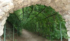 По бокам Подпорной стены Нижней террасы расположены Гроты, представляющие собой каменные арки с примыкающими к ним шпалерами, по которым вьются специально посаженные растения, образуя зеленые «коридоры».