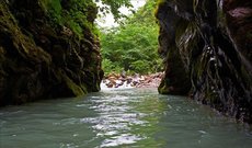 Каньон на реке Хашупсе - интересное место в районе Гагр, Абхазия. Река Хашупсе образуется при слиянии двох рек: Жеопсе и Сандрипша, текущих с окрестностей Ачмарды, и впадает в море, недалеко от российско-абхазской границы. Вскоре после слияния Жеопсе и Сандрипша река входит в Хашупскую теснину – ограниченный высокими вертикальными стенками узкий скальный коридор. Вот эта самая теснина и состоит из нескольких каньонов и прижимов. Это самое живописное место Большого каньона. Также можно посмотреть на Большой каньон с других ракурсов и попробовать заглянуть за поворот самой большой, третьей теснины. Сделать это можно только с воды, проплыв на плавсредствах около ста метров от конца полки, на которую собственно и водят туристов любоваться красотами. Но, это немного экстремальное увлечение, поэтому только бесстрашные люди, которые любят очень активный отдых, умеют плавать, и не боятся холодной воды, смогут это сделать. При всей своей экстремальности, эта экскурсия оставляет самые неизгладимые впечатления. По дороге к Каньону встретятся густые заросли самшита, все покрытые свисающим мхом. Для посещения Каньона желательно иметь на ногах обувь с плотной подошвой и крепко держащуюся на ногах, поскольку идти придется по камням, иногда достаточно острым.