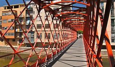 Мост Густава Эйфеля через реку Оньяр в Жироне был сооружен в 1876 году. Это одна из ранних построек известнейшего французского инженера. Древняя Жирона расположилась в месте слияния четырех рек. Одиннадцать мостов были переброшены через главную городскую реку, Оньяр. Один из них был сконструирован в 1876 году знаменитым инженером Густавом Эйфелем. Автор знаменитой парижской башни при жизни был известен как инициатор возведения мостов из стали и использования металлических стяжек, существенно повышающих прочность сооружений. Эйфель сконструировал около двадцати мостов по всему миру, а в Жироне можно увидеть одно из самых компактных его творений, которое, однако, было революционным для своего времени. Мост Густава Эйфеля – это небольшое стальное сооружение, опоры и своды которого окрашены в красный свет. Мост соединяет два берега реки Оньяр, плотно застроенных современными постройками. Создается ощущение, что мост буквально врастает в здания, связывая дома, а не берега, что придает дополнительное очарование этому месту.