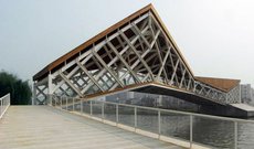 Пешеходный мост Цинпу, строительство которого было завершено в 2008 году, отличается от большинства мостов тем, что соединяет два берега канала DianPuHe не по прямой, а по ломаной линии. Расстояние между берегами канала - 50 метров. Изгибы моста удивительно соответствуют внешней среде, позволяя увидеть контраст северного и южного берегов канала. Мост связывает дорогу Hebin на северном берегу, с районом нового жилищного строительства на южном берегу. Мост - уникальная структура с деревянными крышей и палубой, ассиметричными металлическими структурными опорами чистого белого цвета, которые придают мосту воздушность. Наклонный потолок служит большим отражателем для искусственной системы освещения, которая вмонтирована в перила. Ширина моста: 8 м, поэтому в центральной части моста создается впечатление, что вы находитесь в просторной комнате, плывущей по воде. Создавая этот мост, архитекторы известной строительной фирмы CA-дизайн под руководством испанского архитектора Педро Альба, решили не только проблему коммуникации, но и создали яркое и динамичное пространство на воде.