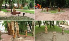 В середине пятидесятых годов в Брянском парке стали одни за другим вымирать столетние вязы. Сначала листва пожухнет, потемнеет и облетит раньше срока. А затем начинает оползать кора, и моют осенние дожди вроде бы и не сучья древесные, а оленьи рога... "Голландская болезнь ильмовых", - неотвратимая, как сама судьба - таково заключение прфессора, доктора биологических наук Б.В. Дроздова. И шли на дрова с виду здоровые деревья. Но вот: "Подобно смычку прикоснулся резец к мертвому телу вяза..." Так зимой 1960 года в Брянском парке появилась первая деревянная скульптура. Под резцом тогда еще молодых модельщиков завода дорожных машин Игоря Жданова и Виктора Михайлова родилась сказка в образе старика - сказочника. И стали приходить в парк все новые и новые волшебники, увидевшие скрытую красоту в засохших стволах. Пришли в парк и школьники из Дворца пионеров, где занимались резьбой по дереву под руководством Константина Ивановича Могута. Через год, другой встали в центре парка "Деснянка" да смешной "Емеля", а в тени молодых кленов притаился "Лесной музыкант". Первые скульптуры, простояв лет 12, истлели. Но на их месте появились новые... Работ, выполненных талантливыми руками народных умельцев, становится все больше. Они образуют самобытный декоративно - парковый ансамбль, получивший широкую известность. Его посетили тысячи туристов из Германии, Индии, Канады, восточноевропейских и других стран. Деснянка, по древнеславянским преданиям - богиня реки Десны, представавшая перед людьми в образе прекрасной девы. С тех пор в народе и говорят: "Десна - красавица". Лель - по древним преданиям, бог любви, завораживавший сердца волшебной музыкой и пением.