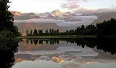 На Зеркальном озере (или озере Мэтисон) у Ледника Фокса природа сочетает именно те компоненты, которые создают действительно удивительное отражение самых высоких вершин Новой Зеландии – Aoraki (горы Кука) и горы Тасмана. Воды озера Мэтисон - темно-коричневого цвета, и в спокойный день они создают идеальную зеркальную поверхность. Цвет вызван природным выщелачиванием органических веществ из окружающей лесной подстилки. По счастливому совпадению, горы на востоке прекрасно расположены для отражения в озере. Легкая прогулка проходит по подвесному мосту над рекой Clearwater, всего в нескольких минутах ходьбы от автостоянки. Clearwater впадает в озеро, и потому коричневатая под мостом, она быстро становится прозрачной и оправдывает свое название. Путь продолжается среди древних лесов, состоящих из деревьев Риму и Катехеа, и выходит на понтон, который простирается к озеру. Территорию вокруг озера огородили колючей проволокой и объявили национальным парком. Въезд, правда, как и везде в Новой Зеландии, бесплатный. У въезда построили автостоянку, кафе и сувенирный магазинчик.