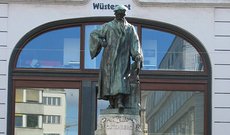 Памятник Иоганну Гутенбергу, изобретателю книгопечатания, стоит в самом центре Вены, недалеко от собора святого Стефана. Памятник был воздвигнут в конце XIX века. Иоганн Гутенберг, мастер из немецкого Майнца, в 1440 году изобрел способ печатать книги, набирая шрифт из отлитых форм – литер. Это изобретение привело к революционным изменениям в европейской культуре, а само имя Гутенберга стало символом прогресса. Памятники Иоганну Гутенбергу установлены в различных городах Германии и Австрии. В Вене монумент мастеру был открыт в 1897 году. Скульпторы Ежи Плечник и Отмар Шимковиц предложили установить бронзовую скульптуру перед витриной венского универмага на площади Люгек. Сегодня в этом здании находится головной офис крупной страховой компании. Бронзовый Гутенберг, моделью для которого послужила средневековая литография, одет в простой костюм типографского мастера. Он смотрит вдаль на собор святого Стефана, встречая гостей города, которые часто останавливаются на площади во время прогулок по историческому центру Вены.