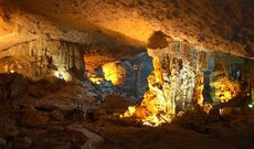 Это один из самых живописных гротов залива Халонг. При входе в пещеру перед вами раскрывается поистине удивительный мир - тысячи сталактитов здесь формируют изящные колонны. Воображение само выискивает в причудливых изгибах пород очертания людей, животных и деревьев... От причала придется подняться по каменной лестнице, которая ведет к входу в Грот Сунг Сот (Грот сюрпризов), расположенному на высоте 25 метров над уровнем моря. Внутри грота вдоль мощеной дороги висят фонари - они помогают не сбиться с пути и добавляют гроту особой загадочности. В гроте Сунг Сот два чертога один из них чем-то похож на театральный зал, с потолка которого свисает большое количество сталактитов причудливых форм и размеров. Во второй чертог можно пройти по узкому проходу. Внутри него могут спокойно разместиться около 1000 человек. Скала около входа чем-то похожа на лошадь с мечом. Местная легенда гласит, что после победы над завоевателями Тхань Донг (Донг Святой) помог прогнать злых духов и демонов. Затем он вознесся на Небеса, оставив на земле свой меч и лошадь. Это было сделано для устрашения демонов, чтобы они держались подальше отсюда. Если пройти вглубь грота, то вы попадете в «королевский сад» с прудом и миниатюрным горным пейзажем. В этот зеленый уголок в солнечные дни в поисках фруктов забираются обезьяны.
