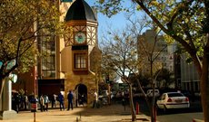 Башня с часами (Clocktower англ., Uhrturm нем.) на углу Индепенденс-авеню (Independence Avenue) и Пост-стрит (Post street) в центре Виндхука, Бывшее здание Немецкого Африканского банка (Deutschen Afrikabank нем.), современная копия с 1908.
