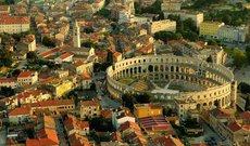 Древнеримский амфитеатр - символ Хорватии, один из самых больших из сохранившихся амфитеатров Древнего Рима, только в этом амфитеатре сохранились все четыре башни комплекса арены. Раньше амфитеатр вмещал до 23 тысяч зрителей, сегодня около пяти тысяч. Бои здесь больше не идут, уступив место кинофестивалям, ярмаркам, театральным постановкам и рыцарским турнирам. Амфитеатр начал увядать в 5-ом столетии н.э., когда Гонорий запретил бои. С тех пор и вплоть до 13-ого столетия местные жители использовали части этого строения для своих нужд. В средние века амфитеатр принимал на обеды скот. Сейчас помимо ярмарок, можно побродить по подземным помещениям амфитеатра, где открыт музей с представленными в нем археологическими находками, сделанными при раскопках.