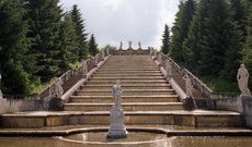 Каскадный фонтан Золотая гора расположен в западной части Нижнего парка в Петергофе. Строительство этого сооружения было начато по распоряжению Петра I, на которого произвели неизгладимое впечатление каскады во французском парке Марли. Строительство фонтана началось в 1721 году,когда архитектор Н.Микетти создал проект оформления склона каскадной лестницей, а завершено было в 1726 году. Скульптуры к фонтану были созданы в 30-е годы XVIII века по проекту архитектора М.Земцова, по его указанию ступени фонтана были облицованы золочеными листами меди, откуда и пошло название фонтана. 14-метровый каскад состоит из 22 ступеней фонтанной лестницы, обрамленной великолепными мраморными и золочеными статуями. Значительная часть мраморных скульптур была установлена здесь в середине XIX века, заменив статуи,установленные по проекту М.Земцова. В двух круглых бассейнах,симметрично по отношению к каскаду, находятся Менажерные фонтаны, построенные по проекту архитектора Н.Микетти в 1722-1725 годах. Дополняется ансамбль фонтана четырьмя фонтанами-колоколами под названием Тритоны, установленными в партерной части Золотой горы. Младенцы-тритоны держат над головами чаши, вода в которые падает в виде пелены, из форсунки, снабженной вогнутой пластиной.