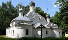 Храм архангела Михаила в усадьбе Архангельское - одна из древнейших каменных построек в усадьбе. Церковь была построена в 1667 году и является памятником архитектуры мирового значения. Строительство церкви велось по инициативе Якова Одоевского, владевшего Архангельским в середине XVII века. Его крепостной зодчий Павел Потехин начал возведение одноэтажной каменной церкви на месте старой деревянной часовни. В центре архитектурной композиции храма располагается четырехугольное основание – четверик, который завершается настоящим каскадом из декоративных каменных полукружных кокошников, образующих пирамиду, завершенную тонкой луковичной маковкой-куполом. По диагонали от главного четверика расположены пределы храма, создающие оригинальную ассиметрию архитектурной композиции. Рядом с церковью была построена трехъярусная колокольня, разобранная из-за ветхости уже в XX веке. После революции в церкви был расположен филиал музея-заповедника Архангельское, велись комплексные работы по реконструкции. Были восстановлены оригинальная форма кровли и световые окна под куполом храма. Сегодня храм возвращен Русской Православной Церкви.