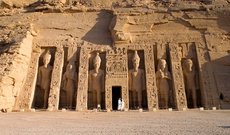 Храм Нефертари расположен к северу от знаменитого храма Рамсеса II. Данное сооружение являлось святилищем, построенным в честь царицы Нефертари, супруги фараона. Удивительный фасад храма образован из шести колоссов, высота которых равна десяти метрам. Две фигуры изображают Нефертари, а четыре из них – царя. Царица увенчана короной, состоящей из двух рогов и перьев, между которыми расположен солнечный диск. Нефертари является воплощением покровительницы Нубии и богини неба. Рядом с царицей расположены небольшие фигуры дочерей фараона, а около Рамсеса – сыновей. При входе в храм Рамсес протягивает цветы своей царице, изображенной в образе красивой богини Исиды. На обратной стороне ворот царь защищает свою Нефертари, поражая азиатов и нубийцев, воздает почести Хору и Амону-Ра и облагает вражеских людей данью.