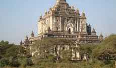 Над многими другими памятниками города Баган в Мьянме возвышается величественное белое здание – храм Тхат Бинь Ю. Он был построен королем Алаунгситху и для своего времени был своеобразным экспериментом, потому что он состоит из двух этажей и не является симметричным. С террас этого храма открывается хороший вид на город Баган, его бесчисленные памятники, широкую реку Иравади, и далекие холмы на востоке и западе. Высота ступы храма составляет 201 фут и вообще весь декор Тхат Бинь Ю словно направлен на то, чтобы подчеркнуть его вертикальные линии: высокие арки, фронтоны, столбы и массивыные лестницы, все это устремляется ввысь. А два ряда окон делают интерьер светлым и просторным. Растительный орнамент на стенах, расположенный в некоторых местах, выглядит изящным и утонченным. Он хорошо сочетается с массивной статуей Будды, сидящего в конце подъема на второй этаж.