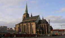 Городской кафедральный собор, архитектурный памятник начала XIV века. Собор, построенный в готическом стиле, представляет собой монументальное величественное сооружение с острой крышей и 102-метровой башней. Кажется, что все здание собора как будто устремлено ввысь, следом за этой башней. Особенно впечатляющей башня была во времена строительства сбора, тогда она являлась вторым по высоте сооружением в Европе. Еще одной достопримечательностью собора является смотровая площадка, расположенная на высоте 62 метра. К площадке ведет 301 ступенька, а в ясную погоду оттуда открывается прекрасный вид на десятки километров вперед. В 2001 году площадка была ограждена плотной сеткой из-за частых попыток самоубийств. Одна из святынь собора и объект паломничества — статуя Пльзенской Девы Марии. Скульптура, расположенная в углублении в главном алтаре, вытесана из песчанистого мергеля, а ее высота составляет 134 сантиметра.