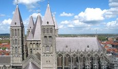 Кафедральный собор Турне, расположенный в самом центре одноименного бельгийского города, ведет свою историю с XII века. Он был освещен в 1171 году. В архитектуре собора пересекаются элементы романского и готического стилей, причем, элементы последнего преобладают. Длина Кафедрального собора Турне, построенного из серого камня, совпадает с длиной Собора Парижской Богоматери и составляет 134 метра. Неф собора в Турне делится на четыре уровня. Над пересечением нефа с трансептом возвышаются 5 башен в романском стиле высотой 83 метра, за что Турне в свое время носил название «город пяти башен». Центральная башня представляет собой квадратную башню-фонарь с восьмиугольной крышей в форме пирамиды, а окружающие башни имеют пирамидальную крыши четырехугольной формы. На протяжении нескольких веков здание подвергалось разрушению, но внутреннее убранство возвращает нас к тем далеким временам, когда собор был построен. Все капители собора, венчающие колонны, имеют различное оформление: растительный орнамент, антропоморфные и зооморфные изображения. Трехуровневый гигантский хор с высокими окнами длиной 58 метров окружен просторной галереей. С 2000 года Кафедральный собор Турне входит в список исторических объектов Всемирного наследия Юнеско.