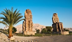 Колоссы Мемнона представляют собой две огромные каменные скульптуры древнеегипетского фараона Аменхотепа Третьего. Они стоят на берегу Нила, в некрополе Фив. Статуи, изображающие сидящего фараона, были установлены примерно в 14 столетии до нашей эры. Руки Аменхотепа покоятся на коленях, а взор обращен к восходящему солнцу и реке. Спереди трона, вдоль ног фараона, вырезаны меньшие по размеру фигуры – Тии, его жены, а также Мутемуйи, матери Аменхотепа. Боковые панели содержат изображение Хапи - бога Нила. Скульптуры выполнены из кварцитно-песчаных блоков, добытых в каменоломне Джебель-эль-Ахмара и перевезенных по земле на расстояние в 670 километров. Высота статуй вместе с платформами составляет 18 метров, а вес каждой из них - около 700 тонн. Они использовались в качестве стражей входа в величественный Погребальный храм фараона, самый крупный и роскошный в Египте, от которого сегодня мало что осталось. Основания Колоссов повреждены периодическими наводнениями.