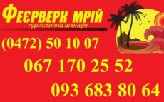 Турагенство "Феєрверк мрій" предоставляет возможность приобрести ГОРЯЧИЕ ТУРЫ туры (максимум предложений по минимальным ценам на туры ), отдых на Чёрном и Азовском море автобусом с выездом из Черкасс и Киева, большой выбор автобусных туров по Европе и Украине, авиа туры по всем направлениям. А так же Вы можете купить авиабилеты на чартерные и регулярные авиарейсы. Оказываем услуги по письменному переводу, апостиль и легализацию документов, помощь и консультации в открытии виз во все страны мира. Продажа и прямое пополнение TravelSIM. С большим выбором туристических услуг Вы можете ознакомиться на нашем сайте: www.hottur.ck.ua Ждём ВАС в нашем офисе!