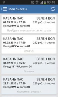 РЖД билеты 1.3 для Android - Если вы пользуетесь услугами электронной регистрации на сайте РЖД, то это приложение поможет вам не забыть ваш номер поезда, время отправления, вагон и место. При запуске в память телефона загружаются последние заказы с сайта ticket.rzd.ru и потом можно в любое время открыть и проверить все данные по купленному билету.ВНИМАНИЕ! Через данное приложение нельзя покупать билеты, возвращать, а также выполнять какие-либо другие операции с ними.