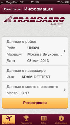 Трансаэро 1.2.0 для iPhone / iPad - Данное приложение предоставляет возможность зарегистрироваться на рейсы авиакомпании «Трансаэро» с iPhone в режиме реального времени. При этом реализована возможность выбора места на «карте мест».Все возможности:- Регистрация на рейс Авиакомпании «Трансаэро» - Личный кабинет для участников «Трансаэро Привилегия» - Просмотр онлайн табло аэропортов «Домодедово» и «Шереметьево», время указано Московское - Ознакомление с информацией об авиакомпании «Трансаэро» и предоставляемых ею услугах.