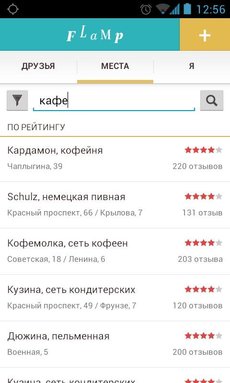 Фламп 1.1 для Android - Перед вами справочник с отзывами о компаниях города и удобный поиск по заведениям. Выбирайте лучшие места и компании, читайте отзывы и делитесь собственным опытом откуда угодно. Фламп в вашем Android — это:- Справочник с рейтингом компаний и отзывами в 5 городах: Новосибирске, Москве, Красноярске, Екатеринбурге и Казани - Поиск компаний вашего города по местонахождению, по времени работы и другим параметрам - Чтение отзывов о компании в ленте друзей или в карточке компании - Размещение ваших отзывов, подсказок и фотографий о компании прямо с телефона - Возможность делиться отзывами и фотографиями в социальных сетях Вконтакте, Twitter и Facebook.